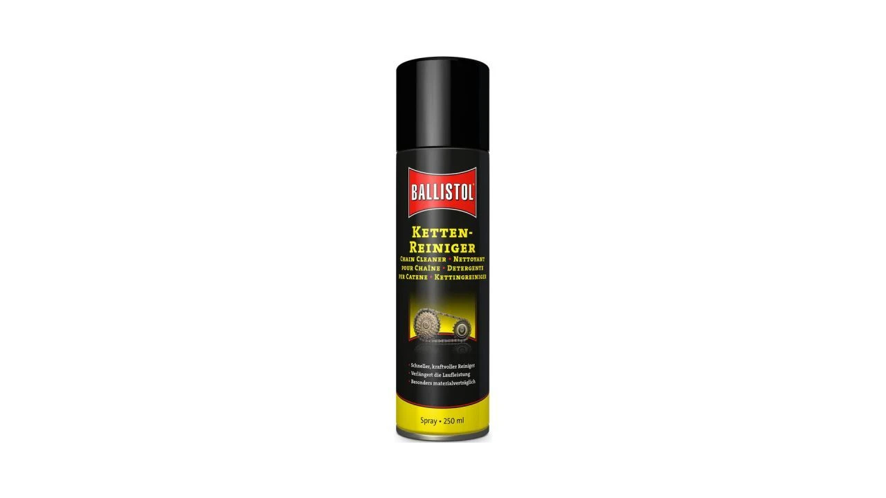 Der BALLISTOL Kettenreiniger entfernt selbstständig hartnäckige Schmiermittel-Rückstände auf Fahrrad- & Motorradketten, Zahnrädern, Rahmen und Felgen.<br>Auch zwischen den Kettengliedern. Neutral gegenüber lackierten Oberflächen, Chrom, Aluminium, Kunststoffen sowie Gummi und Carbon. <br>Enthaltene Korrosionsinhibitoren beugen wirksam dem Entstehen von Rost vor. Regelmäßige Anwendung verlängert zudem deutlich die Laufleistung der Kette.