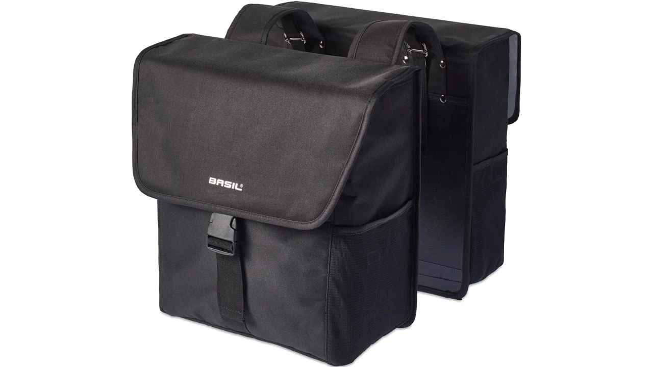 Bei der GO Double Bag von BASIL handelt es sich um eine doppelte Fahrradtasche für den Gepäckträger. Sie ist perfekt für Menschen, die viel mit dem Fahrrad unterwegs sind. <br><br>Egal, ob es um eine Fahrradfahrt zum Supermarkt oder eine Fahrradtour zu Freunden geht: Diese moderne Fahrradtasche macht die Fahrt einfacher und schöner. Die Tasche ist mit einem Kordelzug und Steckschnallen abschließbar. Es sind 2 verstellbare Bänder vorhanden, womit Platz für Gepäckträger-Spanngurte, einen Kindersitz, eine Federklappe oder einen Gepäckträger da ist. <br><br>Die elastischen Seitenfächer bieten Platz für eine Flasche Wasser oder (wenn nötig) einen Regenschirm. Die stabile Tasche ist aus hochwertigem Material gefertigt und hat einen Inhalt von etwa 32 l. So hat man unter allen Umständen genug Platz für Einkäufe, Sportkleidung oder andere Gegenstände. <br><br>Mithilfe der Riemen ist die Tasche leicht an diversen Gepäckträgern anzubringen (auch E-Bikes). Die Reflektordetails sorgen dafür, dass man besser sichtbar ist in Dunkelheit.<br>Die BASIL Go Double Bag ist in Schwarz sowie in Jeansblau erhältlich.