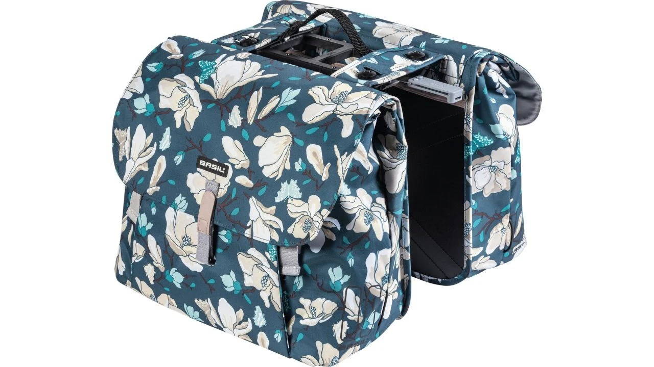 Bei der Magnolia MIK in Blaugrün von BASIL gibt es viel zu entdecken und zu profitieren. Die doppelte Fahrradtasche aus strapazierfähigem Polyester hat eine zweckmäßige Größe für Einkäufe oder andere Sachen. Ihr Gesamtvolumen beträgt 35 l (2x 17,5 l). Es passen also wirklich viele Einkäufe und andere Dinge hinein.<br><br>Mit der vormontierten Adapterplatte wird die Magnolia MIK zur abnehmbaren Tasche. Wie? Man klickt die Tasche mittels der vormontierten Adapterplatte in einen MIK-Gepäckträger oder, falls nicht vorhanden, in eine MIK-Trägerplatte. Ebenso einfach lässt sich die Tasche auch wieder abnehmen. Das ist praktisch, wenn man sein Fahrradzubehör häufiger wechselt.<br><br>Die Tasche ist zudem wasserdicht und schließt mit einem Falt- und Klickverschluss. Sollte es also unterwegs regnen, bleiben die Gegenstände in der Fahrradtasche trocken. Darüber hinaus ist man dank der reflektierenden Details an der Tasche auch bei Dunkelheit gut zu sehen.