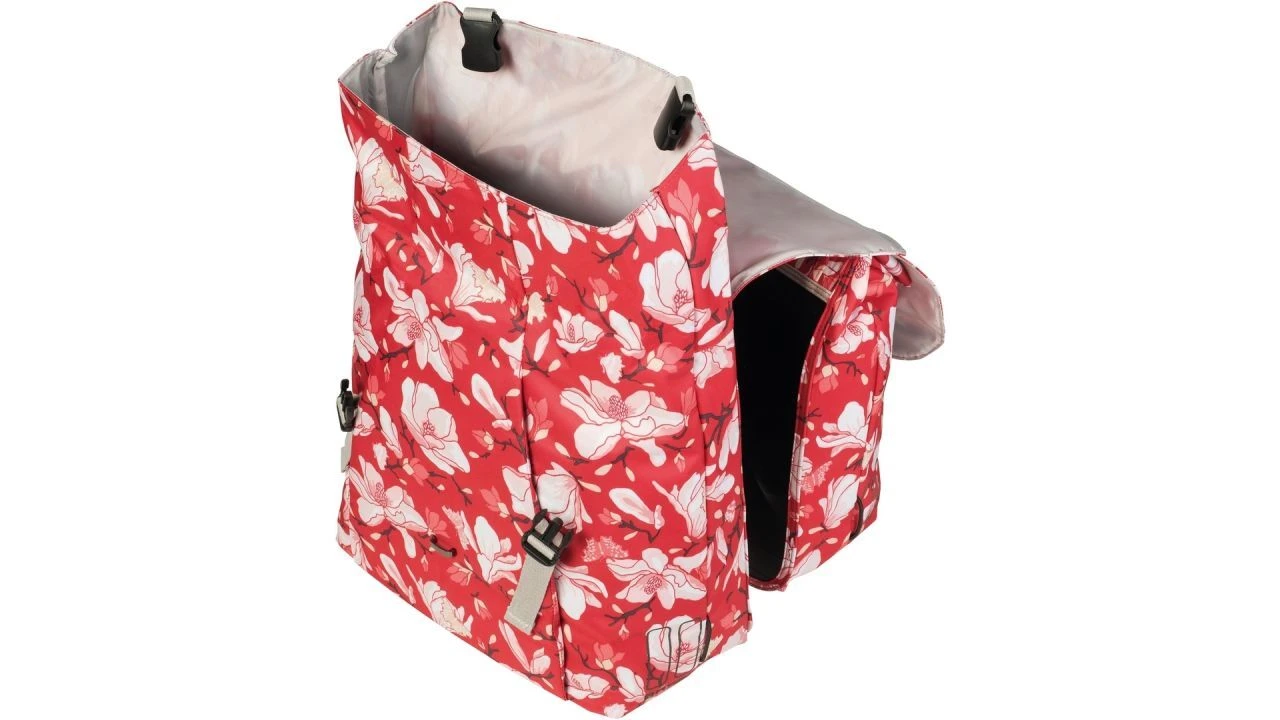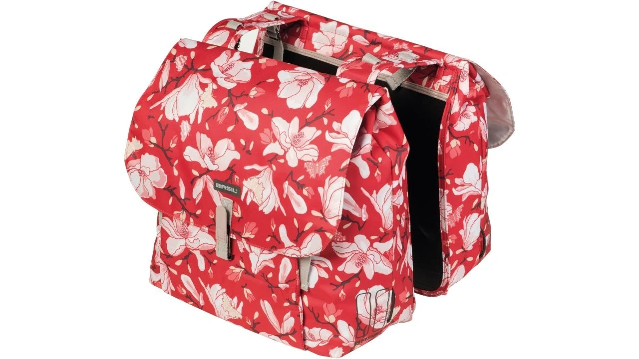 Bei der BASIL Magnolia Double Bag handelt es sich um eine doppelte Fahrradtasche im attraktiven Design. Die Taschen verfügen über einen Gesamtinhalt von 35 l (jeweils 17,5 l) und sind somit ideal für die Aufbewahrung diverser Dinge. So lassen sich darin Einkäufe transportieren. Zudem können Sie darin auch Ihr Lunchpaket verstauen, wenn Sie eine Fahrradtour in die Natur unternehmen. Sie sind dann für alles ausgerüstet und brauchen keinen schweren Rucksack mehr zu tragen. <br><br>Sowas von praktisch: Die doppelte Fahrradtasche ist aus Polyester gefertigt und mit einer stabilen Innenfütterung ausgestattet. Sie ist wasserdicht und lässt sich leicht mithilfe eines Falt- und Klickverschlusses schließen. LED-Beleuchtung kann man ohne Probleme an den Schlaufen der Tasche befestigen. Doch auch ohne Beleuchtung sorgen die reflektierenden Details dafür, dass Sie in Dunkelheit deutlich sichtbar sind. <br><br>Die doppelte Fahrradtasche lässt sich am Gepäckträger mit Hilfe des Universal Bridge-Systems befestigen. Dies bedeutet, dass Sie die Tasche durch die mitgelieferten Riemen am Gepäckträger Ihres Fahrrads befestigen können. Die Tasche eignet sich jedoch auch für Systeme, wie zum Beispiel MIK, Racktime oder i-Rack/Carrymore (Adapterplatte nicht enthalten).