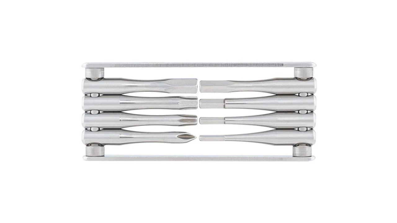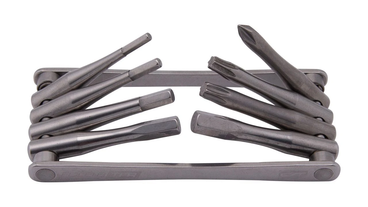 Klassisch kompakt: Das TFR Fold 8 von CONTEC ist ein kompaktes Multitool für den Einsatz unterwegs. Dafür steht das Tool for Ride mit den Maßen 90 x 41 mm und einem Gewicht von 99 Gramm. Die acht Funktionen umfassen die Innensechskantschlüssel mit 2,5 mm, 3 mm, 4 mm, 5 mm und 6 mm sowie einen Kreuzschlitzschraubenzieher. Hinzu kommen die Innensechsrund-Schlüssel T25 und T30. Zum sicheren Arbeiten rasten die einzelnen Werkzeuge bei 90° und 270° ein. Aus hochfestem und rostfreiem Edelstahl gefertigt.