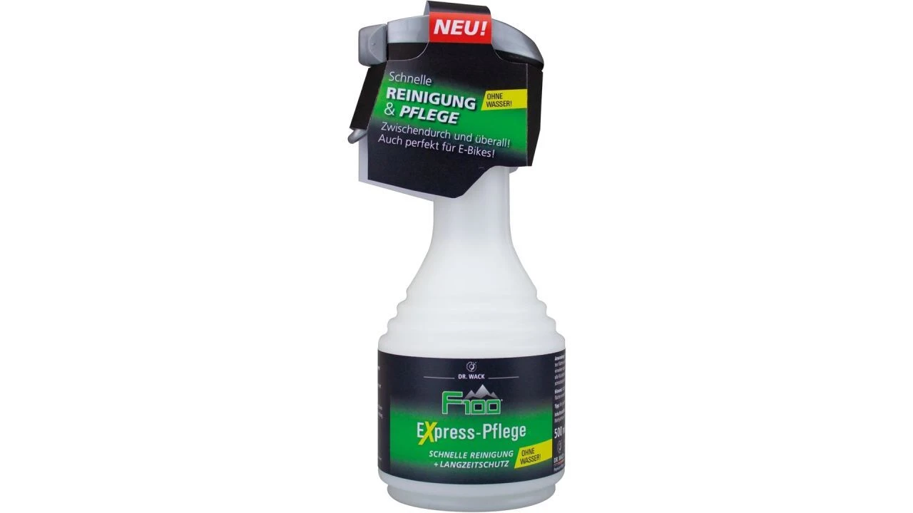 Die F100 Express-Pflege aus dem Hause DR. WACK ist ein Fahrrad-Reiniger zur Bekämpfung von leichten bis mittlere Verschmutzungen geeignet. Das können Staub oder Spritzwasserflecken von der regnerischen Heimfahrt sein. Die wasserlose Reinigung ist materialverträglich und kann daher für optimale Ergebnisse mit dem F100 Mikrofasertuch DAS Tuch – auf allen Oberflächen angewendet werden. Die Reinigung konserviert den Lack und schützt ihn vor Witterungseinflüssen wie Nässe. Schmutz wird es merklich schwerer fallen am Fahrrad haften zu bleiben.