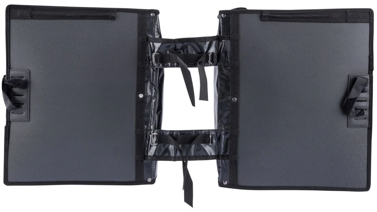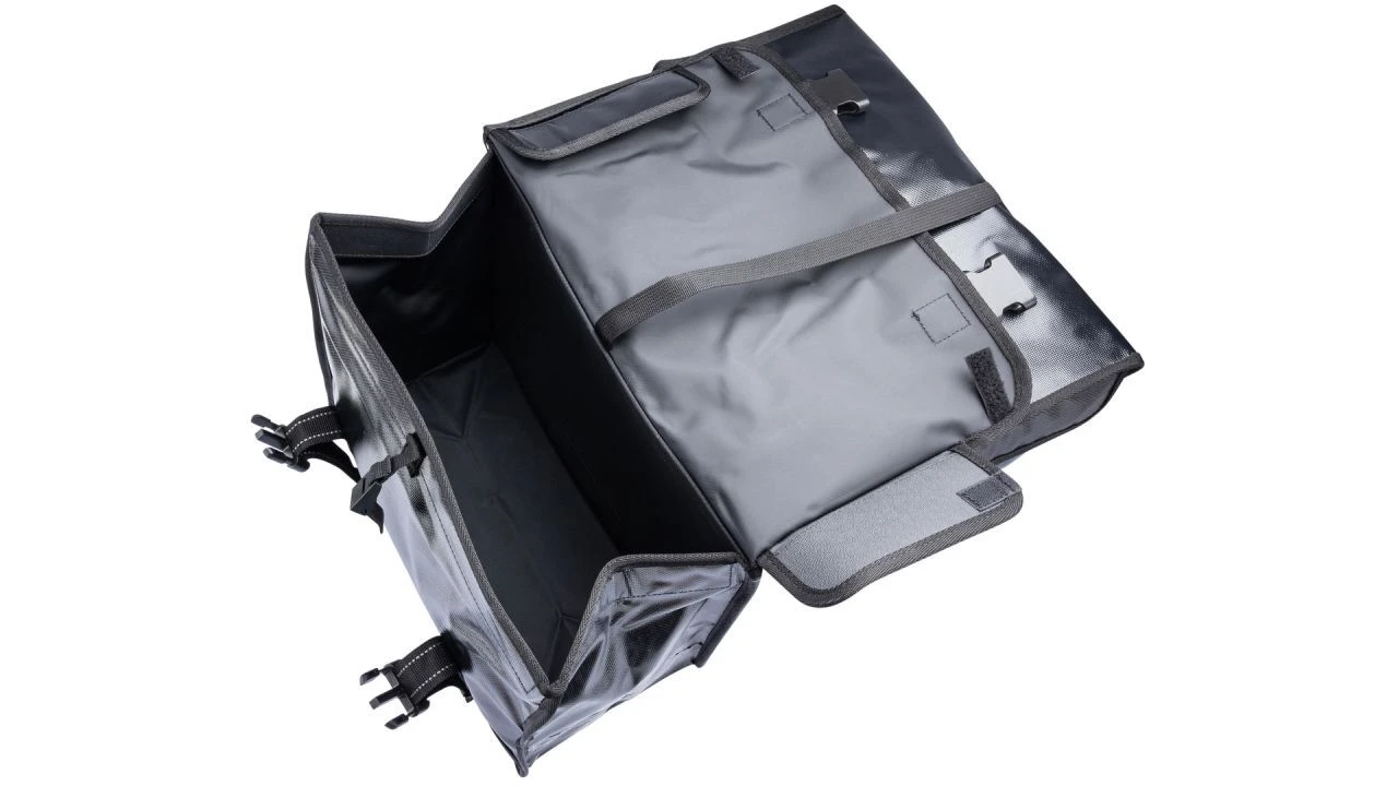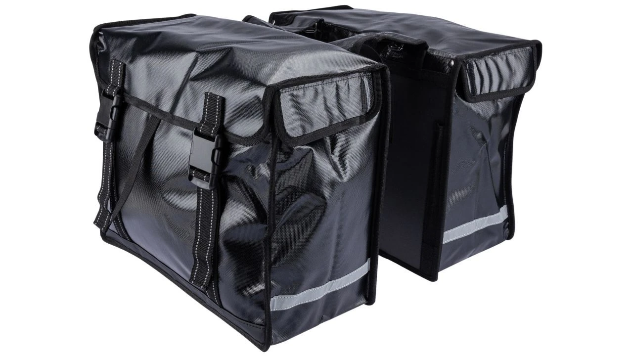 Diese robuste, doppelte Fahrradtasche besteht aus wasserabweisendem Bisonyl. Sie ist auch dank ihrer doppelten Nähte besonders stabil. <br>Um die Sicherheit im Dunkeln zu erhöhen, verfügt die Tasche außerdem über Reflektoren. Sie lässt sich über einen Klickschnallenverschluss leicht öffnen und schließen.