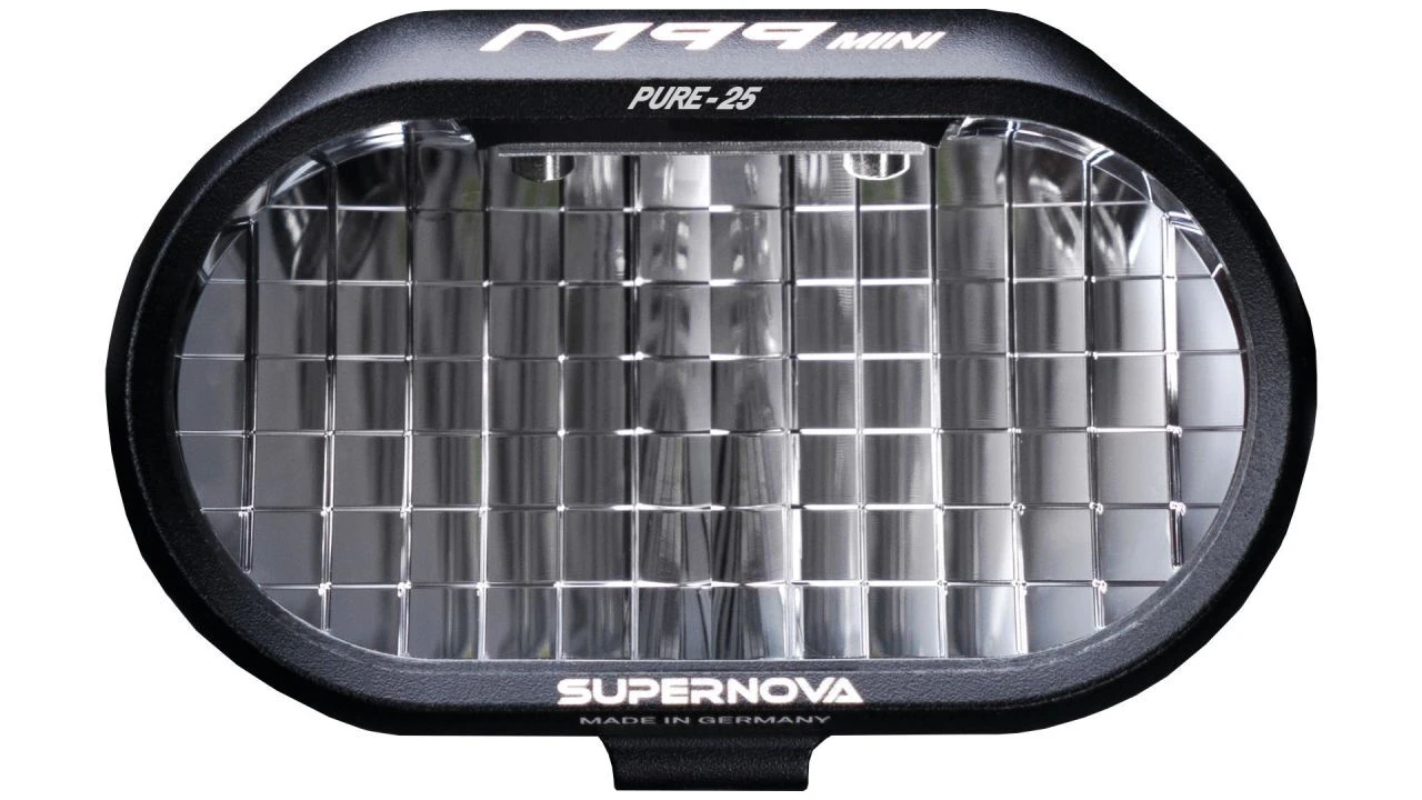 Der M99 Mini Pure-25 LED-Scheinwerfer von SUPERNOVA verschafft Ihnen den optimalen Überblick, sowohl im Straßenverkehr als auch auf dem Trail. Und das auch in Kurven, denn mit seinen gleich fünf LEDs flutet der Scheinwerfer die Fahrbahn in einem immens breiten und 150 Lux (450 Lumen) hellen Lichtfeld aus. Somit sorgt der M99 Mini Pure-25 ganz nebenbei auch dafür, dass auch Sie im Straßenverkehr gut sichtbar sind. <br><br>Die fünf LEDs, den breiten Spiegel und alles weitere Innenleben vereint der M99 Mini Pure-25 auf die kompakten Maße 37x78x50 mm (LxBxH) der Außenform aus Aluminium, sein Gewicht beträgt gerade einmal 110 g.<br><br>Der Scheinwerfer wird über den Pedelec-Akku gespeist. Aber etwa für den Mountainbike-Einsatz im Gelände lässt er sich per USB-Anschluss und Powerbank an jedes beliebige Bike montieren. SUPERNOVA bietet dafür eine Vielzahl an Montagemöglichkeiten. <br><br>An der K-Nummer und dem Wellenzeichen einfach zu erkennen: Der Scheinwerfer ist für den deutschen Markt vom Gesetzgeber (nach StVZO) zugelassen. Der Hersteller gibt auf den SUPERNOVA LED-Scheinwerfer M99 Mini Pure-25 drei Jahre Garantie, auf alle Aluminiumteile sogar zehn Jahre.
