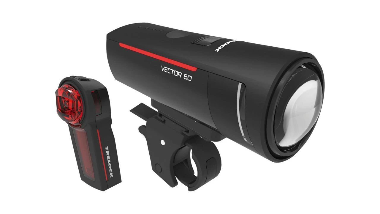 Mit seiner Doppel-Linse leuchtet der neue I-Go Vector von TRELOCK die Fahrbahn mit 60 Lux ansprechend hell aus, zusätzlich sorgt er mit den Seitenfenstern für mehr seitliche Sichtbarkeit. Mit der Leuchtkraft und der Linsentechnik sorgt er für eine Reichweite bis 80 m voraus. Sein Partner im Set, das I-Go Vector Rear Rücklicht, hält einem dazu von der Sattelstütze den Rücken frei. <br>Scheinwerfer und Rücklicht überzeugen mit Ausdauer mit bis zu 15 und 10 Stunden Leuchtdauer. Wie lange sie jeweils noch leuchten, zeigen die Indikatoren an. Aufladen lassen sich beide per USB-Kabel. Ein weiteres Feature: Der Scheinwerfer berechnet im Automatikmodus übrigens die Leuchtstärke nach der Umgebungshelligkeit selbst.